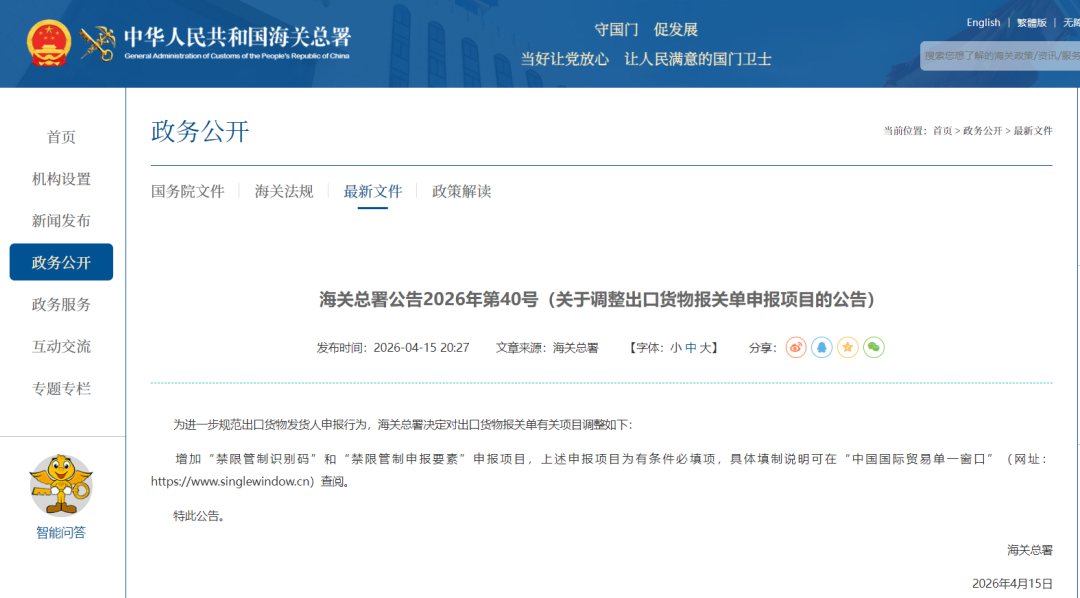 4月15日,海关总署正式发布2026年第40号公告—《关于调整出口货物报关单申报项目的公告》。为进一步规范出口货物发货人申报行为,海关总署决定对出口货物报关单有关项目进行调整。并且增加了“禁限管制识别码”和“禁限管制申报要素”申报项目。