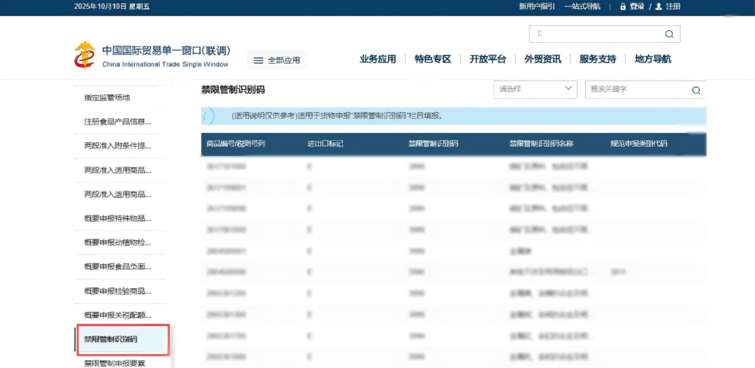 ◆- 查询入口:在“单一窗口”门户网站的参数查询中,提供禁限管制识别码查询入口;