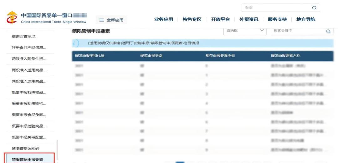 ◆- 查询入口:在“单一窗口”门户网站的参数查询中,提供禁限管制申报要素查询入口;